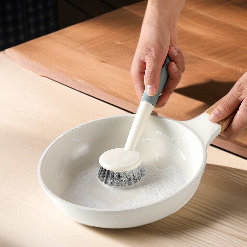 ● ด้ามจับยาวถนัดมือ สะดวกต่อการใช้งาน ทำความสะอาดได้ลึกถึงก้นหม้อ ลดการสัมผัสกับน้ำยาล้างจานโดยตรง